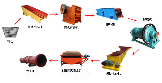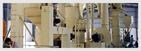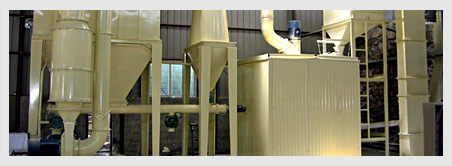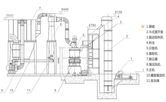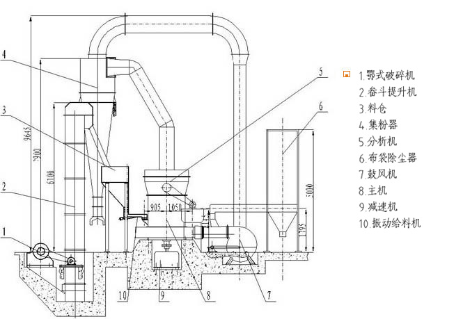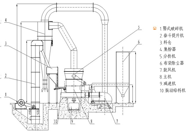 物料经颚式破碎机破碎后由斗式提升机送至储料仓,振动给料机可以把物料均匀、连续地送到主机进行研磨。研磨后的粉末在鼓风机的作用下吹向选粉机进行分选。分选后的物料由管道送到储料仓,最后经出料阀输出即为成品。整套生产线工作过程中气压为负。