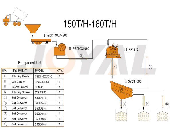 卓亚矿机的150-160TPH 鄂破/反击破整套石料生产设备主要由GZD1100X4200振动给料机、一级破碎PE750X1060颚式破碎机、二级破碎PF1315反击式破碎机、3YZS1860振动筛和配套胶带输送机、电控系统等组成。可对石灰石、大理石、花岗岩、玄武岩、河卵石等物料进行破碎、筛分,生产多种粒度级别的建设用砂石料。可根据客户对石料规格、产量、石料用途的要求,为客户提供合理、经济的设备配置方案。