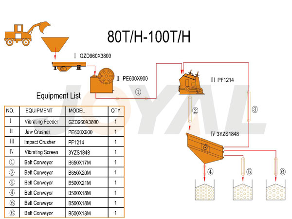 卓亚矿机的80-100TPH 鄂破/反击破整套石料生产设备主要由GZD960X3800振动给料机、一级破碎PE600X900颚式破碎机、二级破PF1214反击式破碎机、3YZS1848振动筛和配套胶带输送机、电控系统等组成。可对石灰石、大理石、花岗岩、玄武岩、河卵石等物料进行破碎、筛分,生产多种粒度级别的建设用砂石料。可根据客户对石料规格、产量、石料用途的要求,为客户提供合理、经济的设备配置方案。