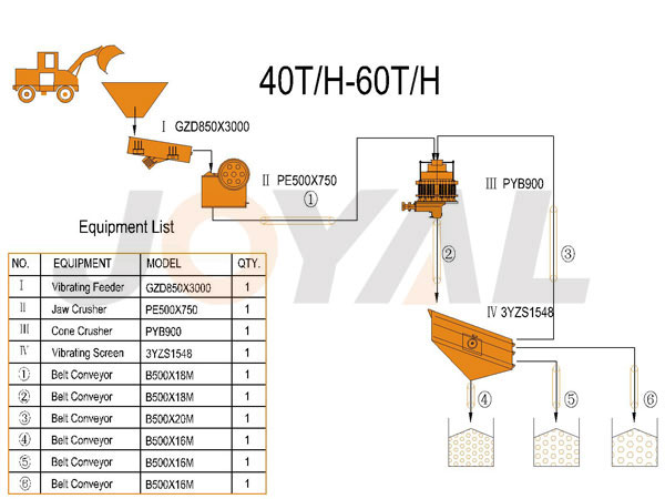 卓亚矿机的40-60TPH 鄂破/圆锥破整套石料生产设备主要由GZD850X3000振动给料机、一级破碎PE500X750颚式破碎机、二级破PYB900圆锥式破碎机、3YZS1548振动筛和配套胶带输送机、电控系统等组成。可对石灰石、大理石、花岗岩、玄武岩、河卵石等物料进行破碎、筛分,生产多种粒度级别的建设用砂石料。可根据客户对石料规格、产量、石料用途的要求,为客户提供合理、经济的设备配置方案。