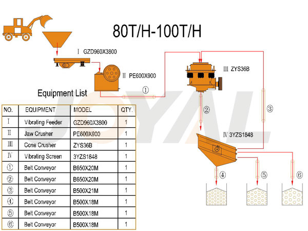 卓亚矿机的80-100TPH 鄂破/圆锥破整套石料生产设备主要由GZD960X3800振动给料机、一级破碎PE600X900颚式破碎机、二级破碎 ZYS36"-B圆锥式破碎机、3YZS1848振动筛和配套胶带输送机、电控系统等组成。可对石灰石、大理石、花岗岩、玄武岩、河卵石等物料进行破碎、筛分,生产多种粒度级别的建设用砂石料。可根据客户对石料规格、产量、石料用途的要求,为客户提供合理、经济的设备配置方案。